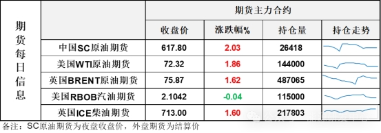 【1】WTI主力原油期貨收漲1.32美元,漲幅1.86%,報72.32美元/桶;布倫特主力原油期貨收漲1.21美元,漲幅1.62%,報75.87美元/桶;INE原油期貨收漲2.03%,報617.8元。