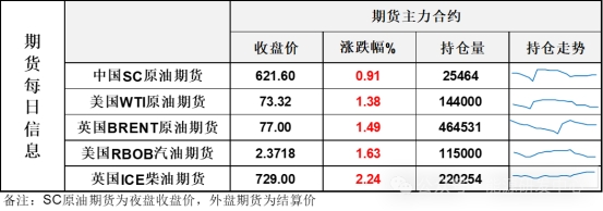 【1】WTI主力原油期貨收漲1美元,漲幅1.38%,報73.32美元/桶;布倫特主力原油期貨收漲1.13美元,漲幅1.49%,報77美元/桶;INE原油期貨收漲0.91%,報621.6元。