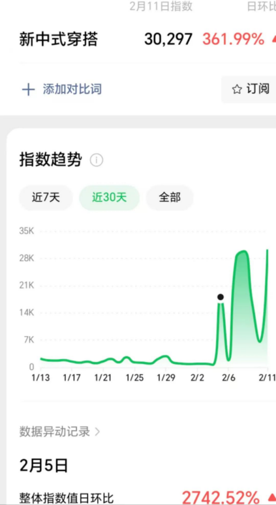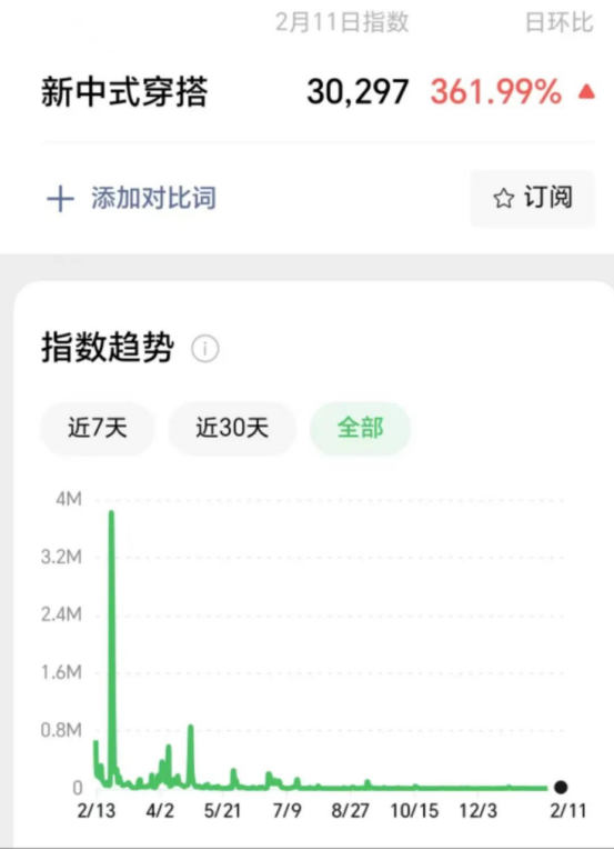 我們看下微信官方提供的基于微信大數(shù)據(jù)分析的微信指數(shù)。數(shù)據(jù)顯示,2024年2月(春節(jié)前后),新中式穿搭熱度曾出現(xiàn)兩波高潮,峰值達到近400萬。而從2024年下半年開始,新中式穿搭熱度逐漸退去。