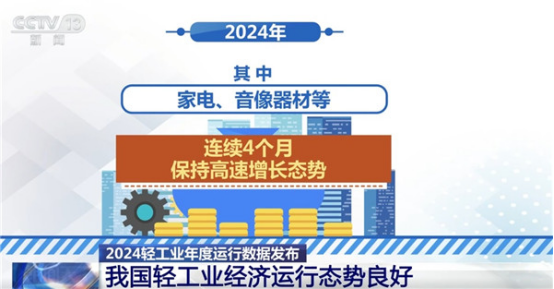 市場穩(wěn)步擴大。隨著一系列擴內(nèi)需、促消費政策發(fā)力顯效,輕工業(yè)市場活力逐步增強。2024年,輕工11類商品零售額近8萬億元,同比增長5.0%。其中,家電、音像器材等連續(xù)4個月保持高速增長態(tài)勢。