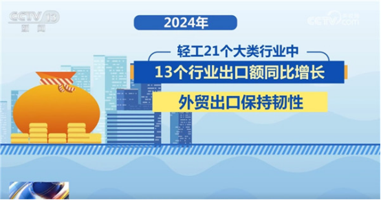 出口穩(wěn)中有增。過去一年,輕工商品出口規(guī)模持續(xù)擴大,結(jié)構(gòu)不斷優(yōu)化。2024年,輕工全行業(yè)出口額同比增長3.6%,連續(xù)3個月保持回升態(tài)勢。輕工21個大類行業(yè)中,13個行業(yè)出口額同比增長,外貿(mào)出口保持韌性。