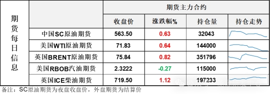 【1】WTI主力原油(607, -8.60, -1.40%)期貨收漲0.46美元,漲幅0.64%,報(bào)71.83美元/桶;布倫特主力原油期貨收漲0.62美元,漲幅0.82%,報(bào)75.84美元/桶;INE原油期貨收漲0.63%,報(bào)563.5元。
