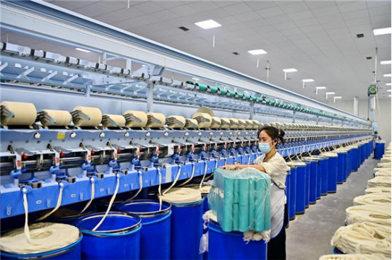 近日,江西省宜春市上高縣工業(yè)園區(qū)的一家民營(yíng)紡織企業(yè)車間內(nèi),工人在智能紡紗生產(chǎn)線上加工出口訂單產(chǎn)品。