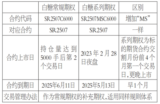 系列期權(quán)(Serial Options)或短期期權(quán),是在現(xiàn)有常規(guī)期權(quán)合約基礎(chǔ)上增掛的新合約,與常規(guī)期權(quán)都基于同一標(biāo)的期貨合約。系列期權(quán)在合約交易代碼中注明系列期權(quán)標(biāo)識MS,如以SR2507為標(biāo)的的常規(guī)期權(quán)合約代碼為SR2507C6000,而系列期權(quán)的合約代碼為SR2507MSC6000,與常規(guī)期權(quán)“插空”共存。
