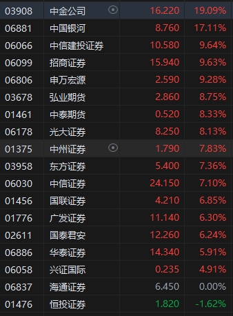 中資券商股整體走強,中國銀河、中金公司短線拉升,分別漲超17%、19%,中信建投、招商證券(15.36, -0.58, -3.64%)、申萬宏源(2.51, -0.08, -3.09%)等超9%跟漲。