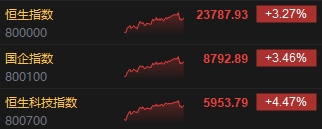 2月26日消息,港股三大指數(shù)高開高走,截至收盤,恒生指數(shù)(23951.449, 163.52, 0.69%)漲3.27%,報23點,恒生科技指數(shù)(6043.23, 89.44, 1.50%)漲4.47%,國企指數(shù)漲3.46%。盤面上,科網(wǎng)股普遍上漲,美團漲超9%,京東集團漲超8%、嗶哩嗶哩、小米集團漲超5%,阿里巴巴漲超4%;中資券商股整體走強,中國銀河(8.19, -0.57, -6.51%)、中金公司(15.28, -0.94, -5.79%)短線拉升,分別漲超17%、19%;內(nèi)房股普遍上漲,世茂集團(1.23, 0.11, 9.82%)超25%領(lǐng)漲;CXO概念股震蕩走高,昭衍新藥(15.26, -0.02, -0.13%)漲超11%。