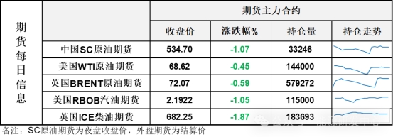 【1】WTI主力原油期貨收跌0.31美元,跌幅0.45%,報68.62美元/桶;布倫特主力原油期貨收跌0.43美元,跌幅0.59%,報72.07美元/桶;INE原油期貨收跌1.07%,報534.7元。