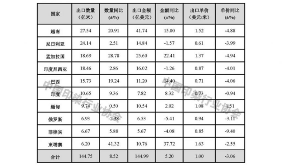 表1 2024年我國印染八大類產(chǎn)品出口前十國家情況