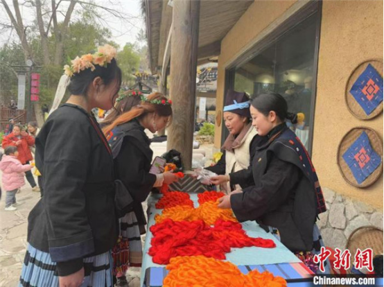 2月13日,“瑤族服飾”廣西區(qū)級(jí)代表性傳承人黎鳳珍(右二)與女兒黎秋億(右一)為游客介紹瑤族服飾所用的紗線