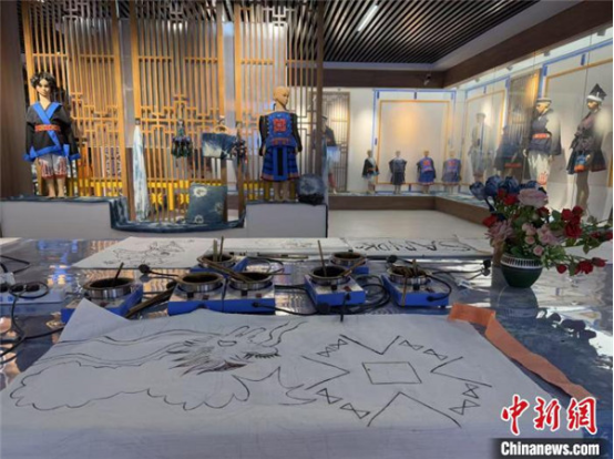 走進(jìn)白褲瑤服飾展示廳,一幅幅粘膏畫布陳列在桌上。黎秋億告訴記者,待用藍(lán)靛上色、晾洗,再將粘膏煮掉,學(xué)員們的粘膏作品就完成了。“在玩中感受非遺,了解非遺,更能激發(fā)對(duì)非遺的興趣。”