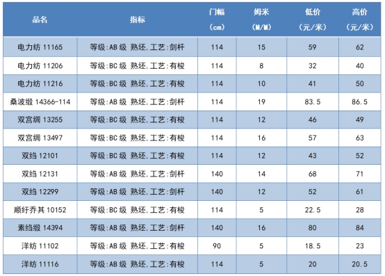 本周綢緞指數(shù)協(xié)作單位成交價格區(qū)間