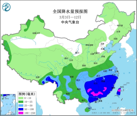 過去10天,氣溫上,全國大部分地區(qū)平均氣溫基本接近常年或偏高,其中新疆北部、內(nèi)蒙古東南部、黃淮南部、江淮、江漢、江南北部和西部等地偏高2~4℃。 未來10天(3月3-12日),江淮、江漢、江南、華南及西南地區(qū)東部等地累計降水量有30~60毫米,其中江南東部、華南北部和東部等地的部分地區(qū)有70~90毫米,局地超過100毫米;上述大部地區(qū)累計降水量較常年同期偏多。