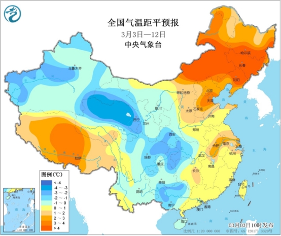 未來10天,中東部氣溫起伏明顯,全國大部分地區(qū)平均氣溫基本接近常年,但內(nèi)蒙古中東部、東北地區(qū)、華北東部以及西藏西部等地平均氣溫較常年同期偏高2~5℃,新疆西部、青海北部、四川盆地、湖北西部、廣西等地平均氣溫偏低1~3℃。