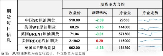【1】WTI主力原油期貨收跌0.11美元,跌幅0.16%,報68.26美元/桶;布倫特主力原油期貨收跌0.58美元,跌幅0.81%,報71.04美元/桶;INE原油期貨收跌2.39%,報518.8元。