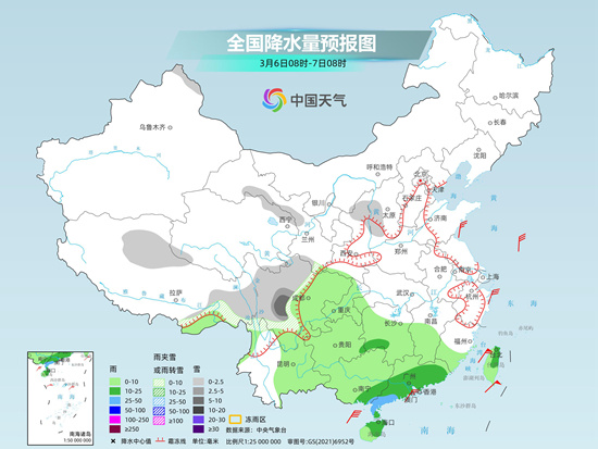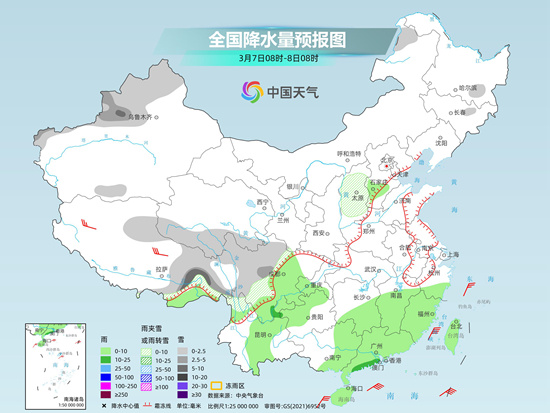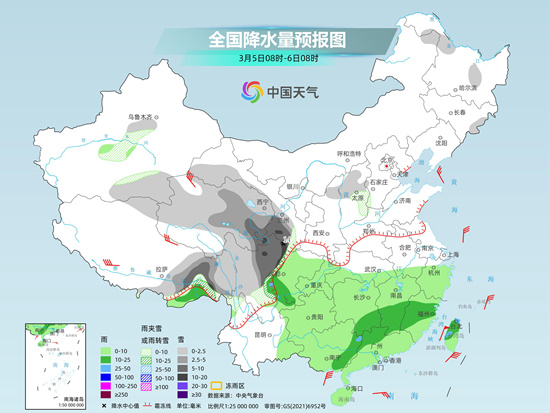 南方未來(lái)三天(3月5日至7日)多陰雨天氣出沒(méi),部分地區(qū)或現(xiàn)大雨,同時(shí)川西高原等地將有降雪,公眾雨雪天氣出行請(qǐng)留意交通安全。受冷空氣和陰雨天氣影響,華南、西南等地今明天氣溫還將下降,濕冷感加重,大家請(qǐng)注意添衣保暖。