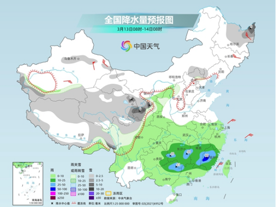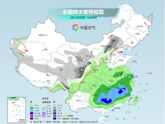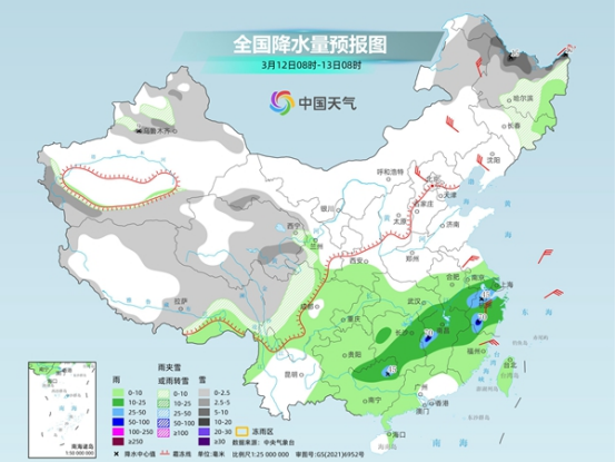 今起至周末,南方將有大范圍降雨天氣,江南、華南部分地區(qū)雨勢較強(qiáng),或現(xiàn)暴雨,上述地區(qū)局地伴有短時強(qiáng)降水、雷暴大風(fēng)等強(qiáng)對流天氣。此外,今天黑龍江、內(nèi)蒙古東部多地仍有降雪,需警惕積雪和道路結(jié)冰對交通的不利影響。