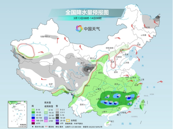 今后三天(3月13日至15日),南方大范圍降雨持續(xù),雨勢有所增強,江南、華南部分地區(qū)需警惕強對流天氣,同時北方雨雪天氣也將逐漸鋪展。隨著新一股冷空氣的到來,中東部大部地區(qū)將迎來明顯降溫,各地會陸續(xù)重返偏冷的氣溫格局。