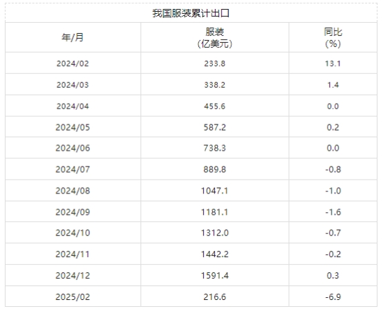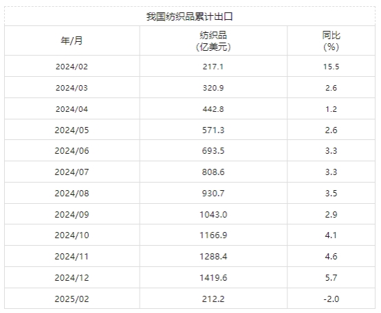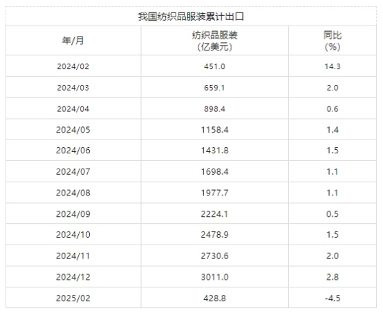 2月我國紡織品服裝出口累計(jì)同比下降4.5%