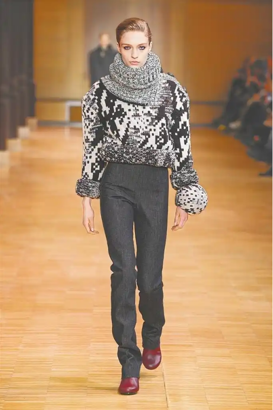紋樣是黎錦的經(jīng)典設計語言。在設計方面,維羅妮克·勒魯瓦以黎錦經(jīng)典小狗紋、甘工鳥、鴿子紋、傳統(tǒng)“大力神”紋樣等,結(jié)合服裝語言進行立體重構(gòu),結(jié)合她標志性泥土色與柔和灰色調(diào),運用變形、放大與解構(gòu)等手法,創(chuàng)造了兼具東方韻味與法式優(yōu)雅的時裝系列。
