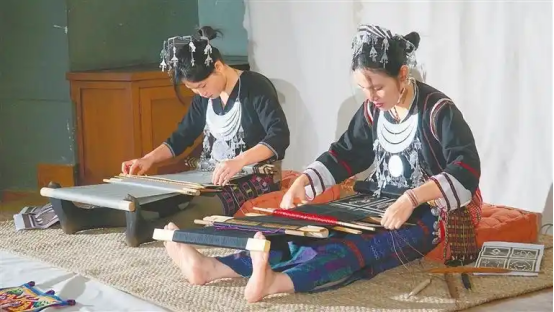 來自五指山的兩位非遺傳承人現(xiàn)場演示黎錦編織技藝