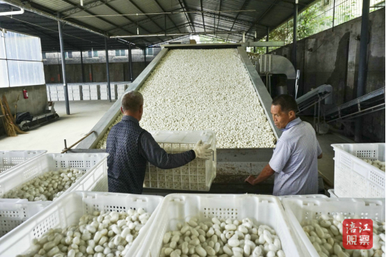 田興維口中的“另一翻景象”,是指進(jìn)入五月,園區(qū)正式進(jìn)入生產(chǎn)養(yǎng)蠶階段,層層疊疊的蠶床上滿是白白胖胖的蠶在咀嚼桑葉,高品質(zhì)的“涪城蠶繭”和生絲陸續(xù)產(chǎn)出并大量出口法國、意大利等國家,成為愛馬仕、LV、香奈兒等奢侈品牌的指定原材料——如此“盛況”早已成為這里的常態(tài)。