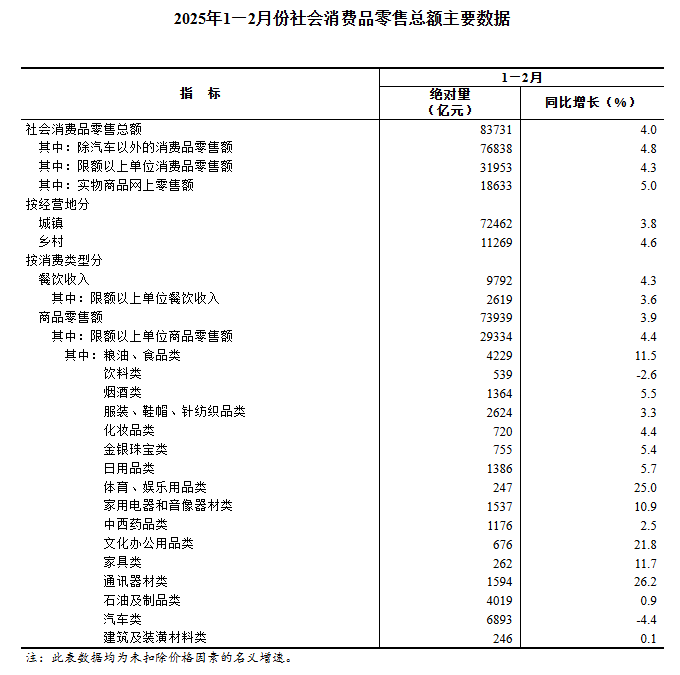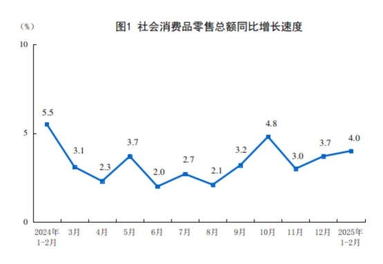 2025年1—2月份社會消費(fèi)品零售總額增長4.0%