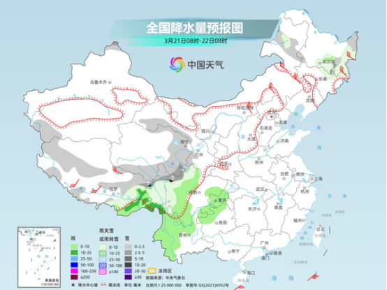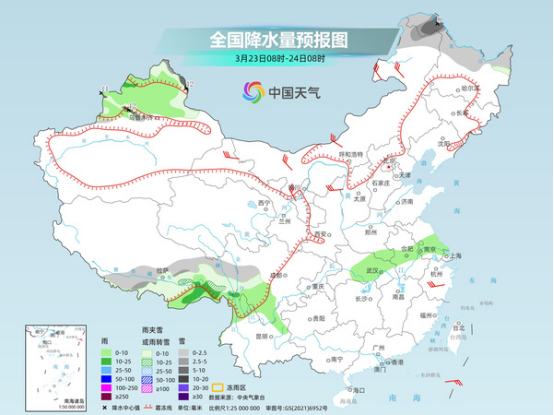 后天,內(nèi)蒙古東北部、黑龍江北部、新疆北疆東部和伊犁河谷、西藏中南部、川西高原中南部等地部分地區(qū)有小到中雪或雨夾雪,其中,黑龍江西北部、新疆北疆東部和伊犁河谷高海拔地區(qū)等地部分地區(qū)有大到暴雪。新疆北部、西藏南部、川西高原南部、云南西北部、湖北東部、安徽中部、江蘇中南部等地部分地區(qū)有小到中雨。
