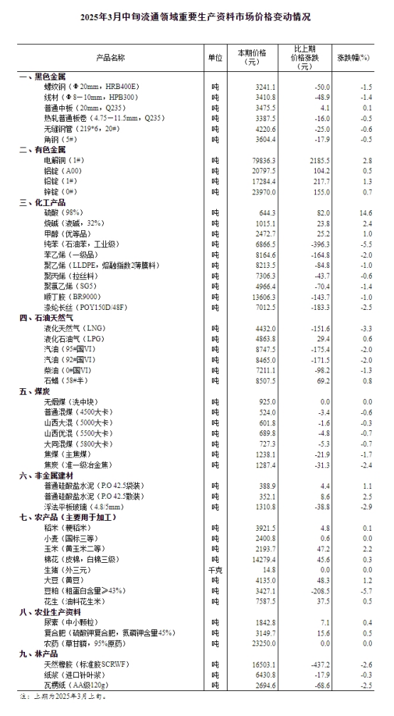 據(jù)國(guó)家統(tǒng)計(jì)局網(wǎng)站消息,國(guó)家統(tǒng)計(jì)局24日發(fā)布2025年3月中旬流通領(lǐng)域重要生產(chǎn)資料市場(chǎng)價(jià)格變動(dòng)情況。