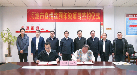 3月23日,河池市宜州區(qū)絲綢印染項(xiàng)目簽約儀式在四川省南充市舉行。項(xiàng)目旨在補(bǔ)齊河池市繭絲綢產(chǎn)業(yè)印染環(huán)節(jié)短板,加快繭絲綢全產(chǎn)業(yè)鏈延伸與完善,推動(dòng)全市繭絲綢產(chǎn)業(yè)高質(zhì)量發(fā)展。河池市市委書(shū)記秦春成、四川依格爾紡織品有限公司董事長(zhǎng)張和才出席簽約儀式。
