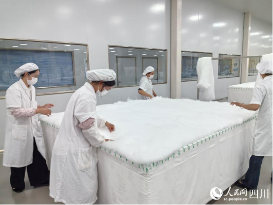 熱門產(chǎn)品是蠶絲被。參觀者們圍攏在蠶絲被制作車間里,觀察體驗(yàn)這種集輕柔、潔白、保暖等優(yōu)點(diǎn)于一身的產(chǎn)品。銷售蠶絲被的電商直播間,就在制作蠶絲被的車間里?,F(xiàn)場(chǎng)直播帶貨的主播對(duì)產(chǎn)品屬性和特點(diǎn)娓娓道來,沒有一點(diǎn)夸張?jiān)熳鳎o參觀者們以更可靠的感覺,有的干脆當(dāng)場(chǎng)下了訂單。