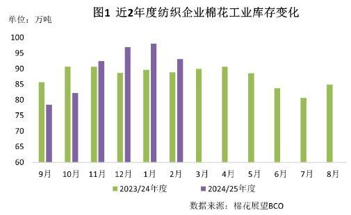 月內(nèi)國(guó)內(nèi)消費(fèi)復(fù)蘇節(jié)奏較緩,同時(shí)美國(guó)加征關(guān)稅加劇國(guó)際經(jīng)貿(mào)環(huán)境不確定性,紗廠對(duì)傳統(tǒng)旺季信心不足,補(bǔ)貨積極性不高,以剛需采購(gòu)為主,總體原料庫(kù)存下降。截至2月28日,紡織企業(yè)在庫(kù)棉花工業(yè)庫(kù)存量為93.1萬(wàn)噸,較上月底減少4.9萬(wàn)噸,同比增加4.3萬(wàn)噸。其中:22%的企業(yè)增加棉花庫(kù)存,31%減少庫(kù)存,47%基本保持不變。