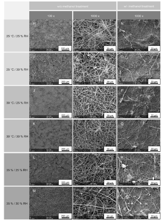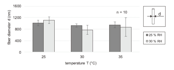 纖維形貌:25°C、30% RH:纖維表面液滴增多,直徑標(biāo)準(zhǔn)差大。35°C、30% RH:纖維直徑差異最大(418 nm),結(jié)構(gòu)松散。30°C、25% RH:纖維最均勻(998±63 nm),無(wú)缺陷(圖2)。