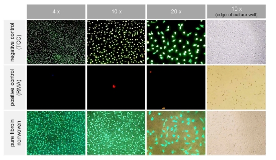 細(xì)胞毒性實(shí)驗(yàn)表明:純絲素蛋白非織造布的細(xì)胞代謝活性與陰性對(duì)照組(TCC)無(wú)顯著差異(p>0.05),遠(yuǎn)高于陽(yáng)性對(duì)照組(含ZDEC的聚氨酯膜)。染色顯示,纖維表面細(xì)胞存活率>95%,形態(tài)舒展,無(wú)毒性跡象(圖4)。