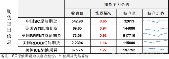 【1】WTI主力原油期貨收漲0.65美元,漲幅0.94%,報(bào)69.65美元/桶;布倫特主力原油期貨收漲0.67美元,漲幅0.93%,報(bào)73.06美元/桶;INE原油期貨收漲0.65%,報(bào)542.9元。