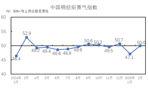 說明:中國棉紡織行業(yè)景氣指數(shù)采集自全國近500家次棉紡織廠,參考國家制造業(yè)PMI等指數(shù)制定方式,通過對多個主要指標(biāo)加權(quán)計(jì)算得出,當(dāng)指數(shù)高于50,表示棉紡織行業(yè)本月景氣程度好于上月,低于50則表示本月景氣程度不及上月。