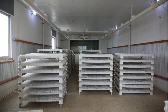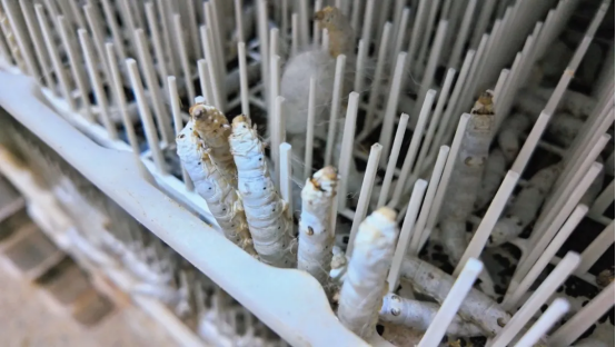 在溫室標(biāo)準(zhǔn)化蠶房內(nèi),先進(jìn)的釘釘蔟發(fā)揮著神奇作用,蠶寶寶能夠自動上蔟結(jié)繭,成果繭率高達(dá)98%。放眼望去,蔟上布滿了白皚皚的蠶繭,豐收景象喜人,預(yù)示著收獲季的到來。