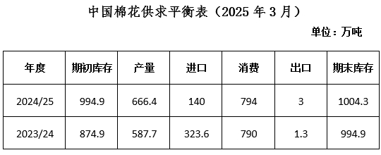 國內(nèi)提振消費的各項政策正逐步落地實施,美國加征關(guān)稅帶來的影響需進(jìn)一步觀察,中國棉花協(xié)會3月平衡表未作調(diào)整,預(yù)計2024/25年度全國棉花產(chǎn)量為666.4萬噸,同比增長13.4%;進(jìn)口量140萬噸,同比下降56.7%;消費量794萬噸,同比略增0.5%。進(jìn)入3月,新疆地區(qū)棉農(nóng)積極進(jìn)行春播準(zhǔn)備工作,南疆大部棉區(qū)棉花適宜播種期略早于常年。