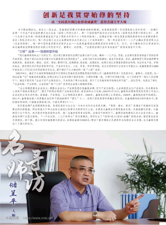 在中國絲綢業(yè)內(nèi),有這么一家企業(yè),憑借超前的眼光和持續(xù)創(chuàng)新的精神,如集郵般獲得一系列國家級認(rèn)定和獎項——絲綢行業(yè)第一個農(nóng)業(yè)產(chǎn)業(yè)化國家重點龍頭企業(yè)(國家八部委認(rèn)定)、第一個國家循環(huán)經(jīng)濟試點示范單位(國家發(fā)改委等六部委認(rèn)定)、第一個且是行業(yè)內(nèi)唯一的國家桑蠶繭絲產(chǎn)業(yè)工程技術(shù)研究中心(科技部批準(zhǔn)),絲綢業(yè)內(nèi)唯一的全國繭絲綢服裝家紡知名品脾創(chuàng)建示范區(qū)(質(zhì)檢總局認(rèn)定)、唯一的全國工業(yè)企業(yè)品牌培育試點示范企業(yè)(工信部表彰)、唯一的全國農(nóng)村一二三產(chǎn)業(yè)融合發(fā)展領(lǐng)軍全業(yè)(農(nóng)業(yè)部表彰)、唯一的中國質(zhì)量獎提名獎獲獎企業(yè)……這就是鑫緣繭絲綢集團股份有限公司。近日,本刊編輯來到江蘇海安市,采訪鑫緣繭絲綢集團股份有限公司黨委書記、董事長、總經(jīng)理,“全國繭絲綢行業(yè)終身成就獎”獲得者儲呈平大師。