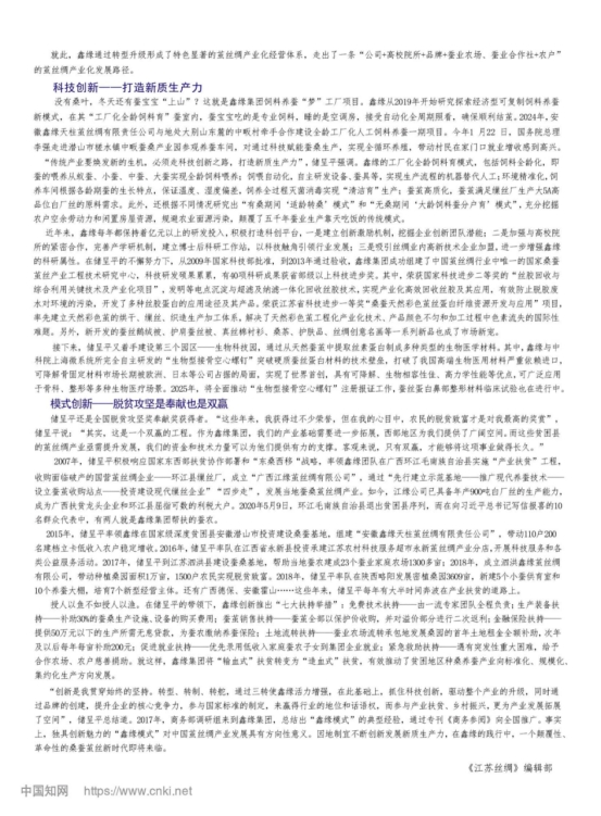 “創(chuàng)新是我貫穿始終的堅持。轉(zhuǎn)型、轉(zhuǎn)制、轉(zhuǎn)舵,通過三轉(zhuǎn)使鑫緣活力增強,在此基礎(chǔ)上,抓住科技創(chuàng)新,驅(qū)動整個產(chǎn)業(yè)的升級,同時通過品牌的創(chuàng)建,提升企業(yè)的核心競爭力,參與國家標(biāo)準(zhǔn)的制定,來贏得行業(yè)的地位和話語權(quán),而參與產(chǎn)業(yè)扶貧、鄉(xiāng)村振興,更為產(chǎn)業(yè)發(fā)展拓展了空間”,儲呈平總結(jié)道。2017年,商務(wù)部調(diào)研組來到鑫緣集團,總結(jié)出“鑫緣模式”的典型經(jīng)驗,通過??渡虅?wù)參閱》向全國推廣。事實上,獨具創(chuàng)新魅力的“鑫緣模式”對中國繭絲綢產(chǎn)業(yè)發(fā)展具有方向性意義。因地制宜不斷創(chuàng)新發(fā)展新質(zhì)生產(chǎn)力,在鑫緣的踐行中,一個顛覆性、革命性的桑蠶繭絲新時代即將來臨。