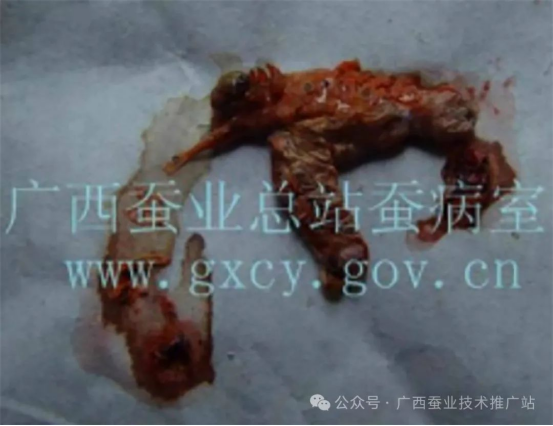 8.細(xì)菌性中毒?。杭倚Q感染病原突然停止食桑,胸部略膨脹,痙攣性顫動(dòng)側(cè)躺而死;有鉤嘴狀,腹部伸長(zhǎng),有輕微尸僵現(xiàn)象,最后全身發(fā)黑腐爛。(如下圖)