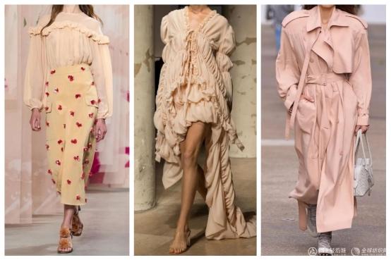 在服裝設(shè)計(jì)中,柔霧粉常常被用來(lái)打造浪漫、優(yōu)雅的風(fēng)格,通常與輕薄的紗質(zhì)面料結(jié)合,層層疊疊的裙擺如同云霧般飄逸,再加上精致的蕾絲刺繡和珍珠裝飾,營(yíng)造出夢(mèng)幻的氛圍。其與復(fù)古風(fēng)格結(jié)合,通過(guò)泡泡袖、荷葉邊等元素的應(yīng)用,打造出復(fù)古、甜美的風(fēng)格。