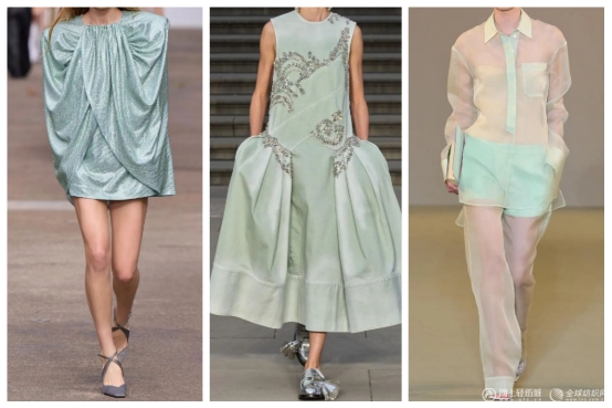水玻璃色有著多樣的搭配可能。搭配銀色或白色,能進(jìn)一步提升整體造型的通透感,給人清新脫俗的印象;與蜜桃軟糖色搭配,則能形成冷暖對(duì)比,碰撞出活潑又獨(dú)特的時(shí)尚“火花”。在材質(zhì)運(yùn)用和剪裁設(shè)計(jì)上,水玻璃色同樣展現(xiàn)出多變的風(fēng)格:通過(guò)光澤感絲綢、珠光涂層面料,結(jié)合不對(duì)稱(chēng)剪裁,能夠打造出極具未來(lái)感的廓型,彰顯設(shè)計(jì)師的先鋒時(shí)尚態(tài)度;當(dāng)它與啞光棉質(zhì)面料混搭時(shí),又巧妙地弱化了科技冷感,讓整體風(fēng)格更顯日常優(yōu)雅,適合各種生活場(chǎng)景。