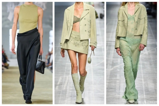 青檸奶油色尤其適合與光澤感材質(zhì)的面料結(jié)合,如緞面、皮革等,光澤感面料與青檸奶油色的啞光風(fēng)格融合,優(yōu)雅中透出知性。青檸奶油色常與白色、淺灰色搭配,強(qiáng)化自然、純凈的氛圍。設(shè)計(jì)師將其運(yùn)用于風(fēng)衣或夾克等單品中,搭配褶皺設(shè)計(jì)或鏤空紋理,能傳遞出慵懶而又不失活力的氣息。