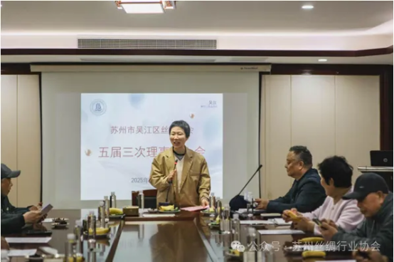 3月28日下午,蘇州市吳江區(qū)絲綢協(xié)會五屆三次理事擴大會在江蘇華佳投資有限公司召開。協(xié)會理事、會員、老領導及特邀嘉賓35人出席了會議。江蘇華佳絲綢股份有限公司俞金鍵董事長首先致辭。她簡要介紹了華佳公司成長的歷程,并對吳江區(qū)絲綢協(xié)會五屆三次理事擴大會的召開表示熱烈的歡迎和祝賀。