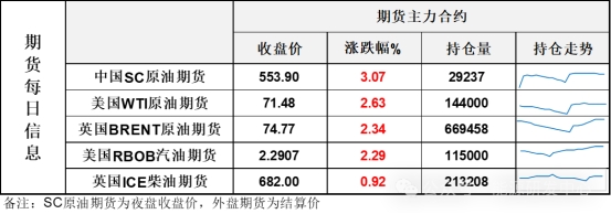 【1】WTI主力原油期貨收漲1.83美元,漲幅2.63%,報(bào)71.48美元/桶;布倫特主力原油期貨收漲1.71美元,漲幅2.34%,報(bào)74.77美元/桶;INE原油期貨收漲3.07%,報(bào)553.9元。