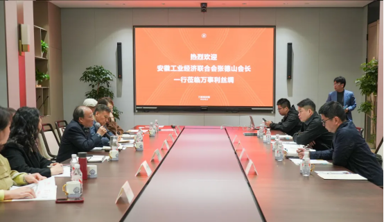 萬事利集團(tuán)絲綢文化股份公司總經(jīng)理余志偉、集團(tuán)公司董事長助理趙婧、絲路聯(lián)創(chuàng)BU副總經(jīng)理閆楊田和安徽業(yè)務(wù)部總經(jīng)理?xiàng)罘脚?、總監(jiān)潮廷等,熱情接待了安徽工經(jīng)聯(lián)一行,并進(jìn)行座談。