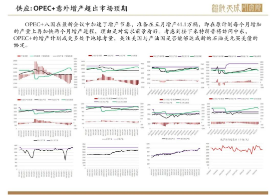 供應(yīng):OPEC+八國(guó)會(huì)議意外加速了增產(chǎn)計(jì)劃,在5月將增產(chǎn)進(jìn)程加快了兩個(gè)月,超出市場(chǎng)預(yù)期,或更多出于地緣政治考量,關(guān)注特朗普的中東訪問(wèn)計(jì)劃。