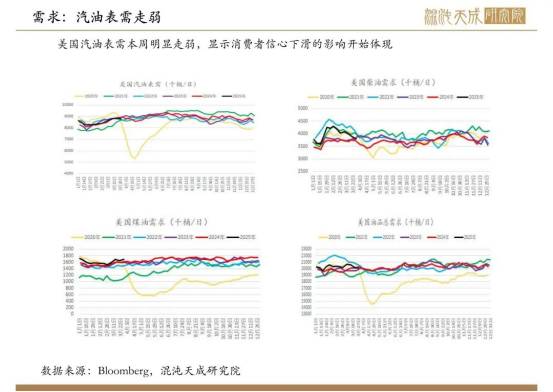 需求:EIA汽油表需明顯走弱,或體現(xiàn)了美國(guó)消費(fèi)者信心下滑的影響,但美國(guó)微觀貨運(yùn)出行數(shù)據(jù)仍然偏強(qiáng)。特朗普關(guān)稅幅度明顯超出了全球經(jīng)濟(jì)能承受的幅度,而中國(guó)的反制使市場(chǎng)對(duì)馬上達(dá)成貿(mào)易協(xié)議的信心減弱,因此引發(fā)了金融恐慌。
