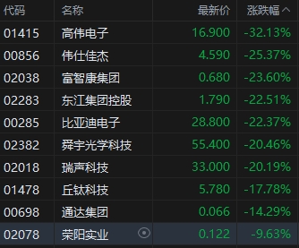 4月7日消息,港股三大指數(shù)全天走弱,截至收盤,恒生指數(shù)(19828.301, -3021.51, -13.22%)跌13.22%,報19828.30點(diǎn),恒生科技指數(shù)(4401.51, -911.75, -17.16%)跌17.16%,國企指數(shù)跌13.75%。盤面上,科網(wǎng)股全線大跌,聯(lián)想集團(tuán)(7.58, -2.25, -22.89%)跌超22%,小米集團(tuán)跌超20%,嗶哩嗶哩跌近20%,快手跌超18%,網(wǎng)易、阿里巴巴跌超17%,京東集團(tuán)跌超15%;蘋果概念股集體大跌,高偉電子(16.9, -8.00, -32.13%)跌超32%;航空股全線走低,中國東方航空股份(2.17, -0.35, -13.89%)跌超14%;農(nóng)業(yè)板塊部分堅(jiān)挺,十月稻田漲超28%。