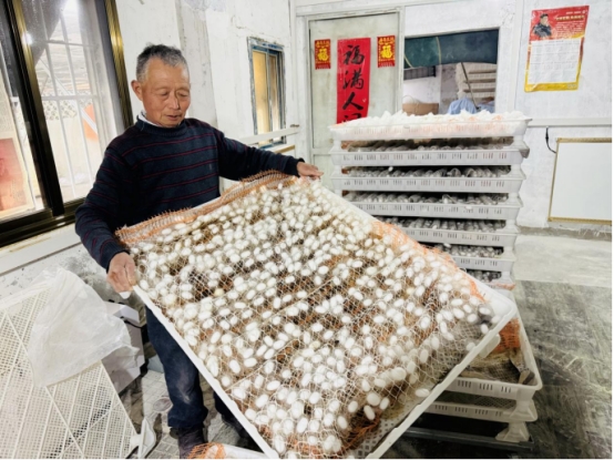 隨著工業(yè)化進(jìn)程的加快以及農(nóng)村勞動(dòng)力的逐漸老化,蠶桑產(chǎn)業(yè)轉(zhuǎn)型升級(jí)勢(shì)在必行,家蠶人工飼料培育與傳統(tǒng)家蠶飼養(yǎng)相比,具有省工、省時(shí)、省力且一年四季均可飼養(yǎng)的優(yōu)勢(shì),很好地解決了人工、季節(jié)對(duì)傳統(tǒng)養(yǎng)蠶方式的制約問(wèn)題。作為鑫緣集團(tuán)2025年的首批工廠化飼料蠶農(nóng)村飼養(yǎng)試點(diǎn),吳冠群在村黨總支大力支持和鑫緣集團(tuán)技術(shù)指導(dǎo)下,飼料蠶從一張紙、兩張紙飼養(yǎng)起慢慢積累經(jīng)驗(yàn),至今已成功飼養(yǎng)了第四批,今年春節(jié)的一張紙創(chuàng)下了最好產(chǎn)量每張達(dá)58公斤。
